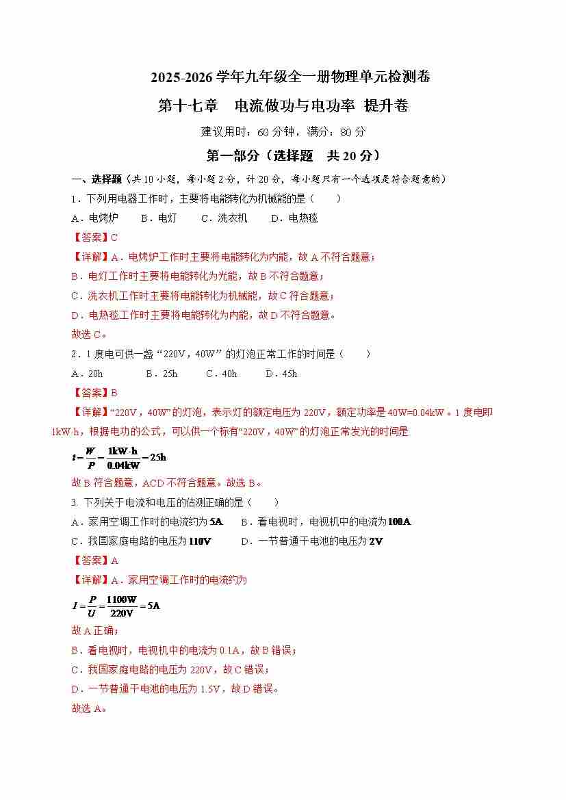 九全一册 第十七单元 电流做功与电功率 单元测试·提升卷(解析版)