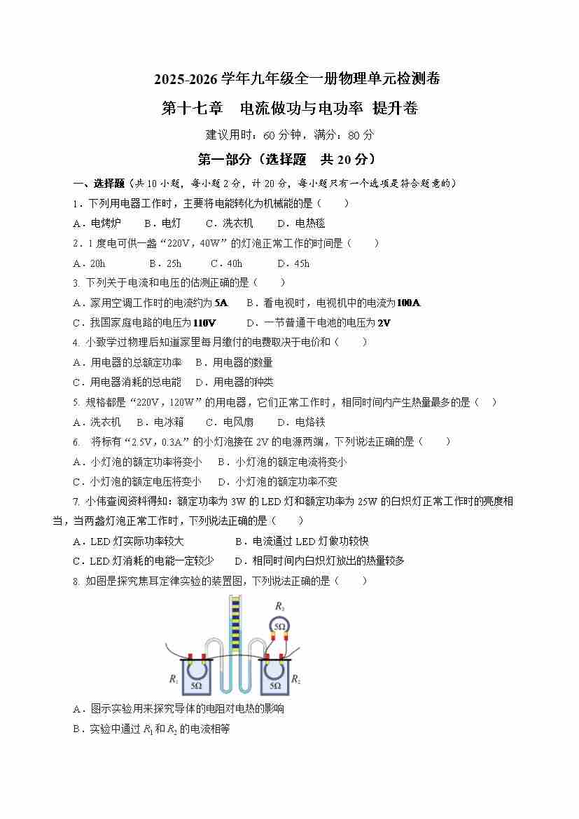 九全一册 第十七单元 电流做功与电功率 单元测试·提升卷(考试版A4)