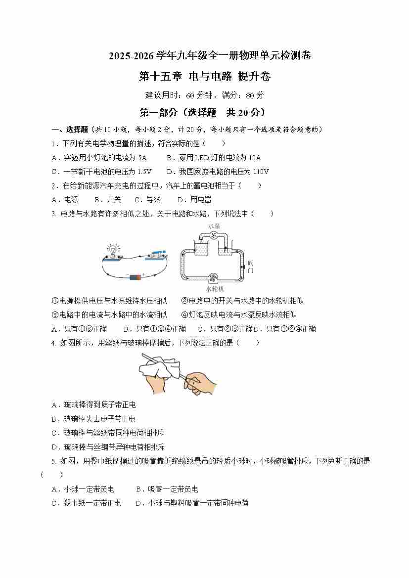 九全一册物理第十五单元 电与电路 单元测试·提升卷(考试版A4)