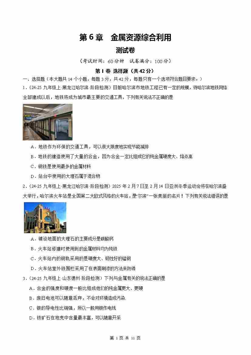 第6章 金属资源综合利用【单元卷·测试卷】(原卷版)