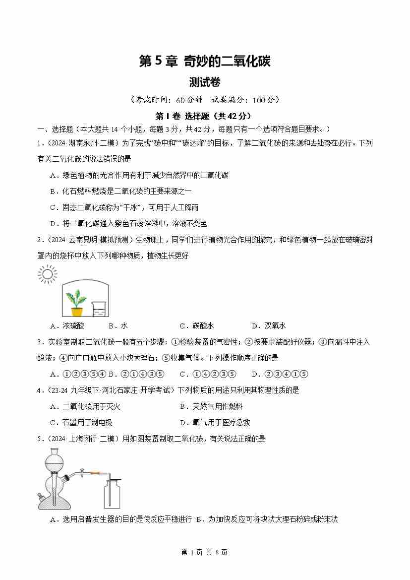 第5章 奇妙的二氧化碳【单元卷·测试卷】(原卷版)