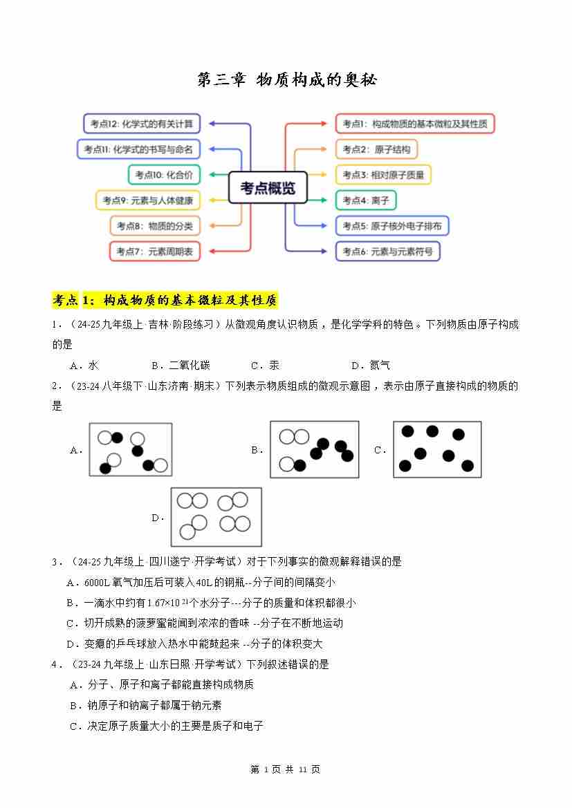 第3章 物质构成的奥秘【单元卷·考点卷】(原卷版)