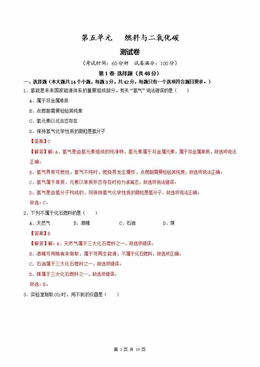 第5单元 燃料与二氧化碳【单元卷·测试卷】(解析版)