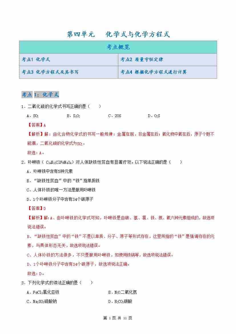 首页 > 全部 > 单元测试 > 第4单元 化学式与化学方程式【单元卷·考点卷】(解析版)