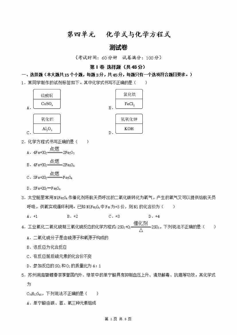 首页 > 全部 > 单元测试 > 第4单元 化学式与化学方程式【单元卷·测试卷】(原卷版)