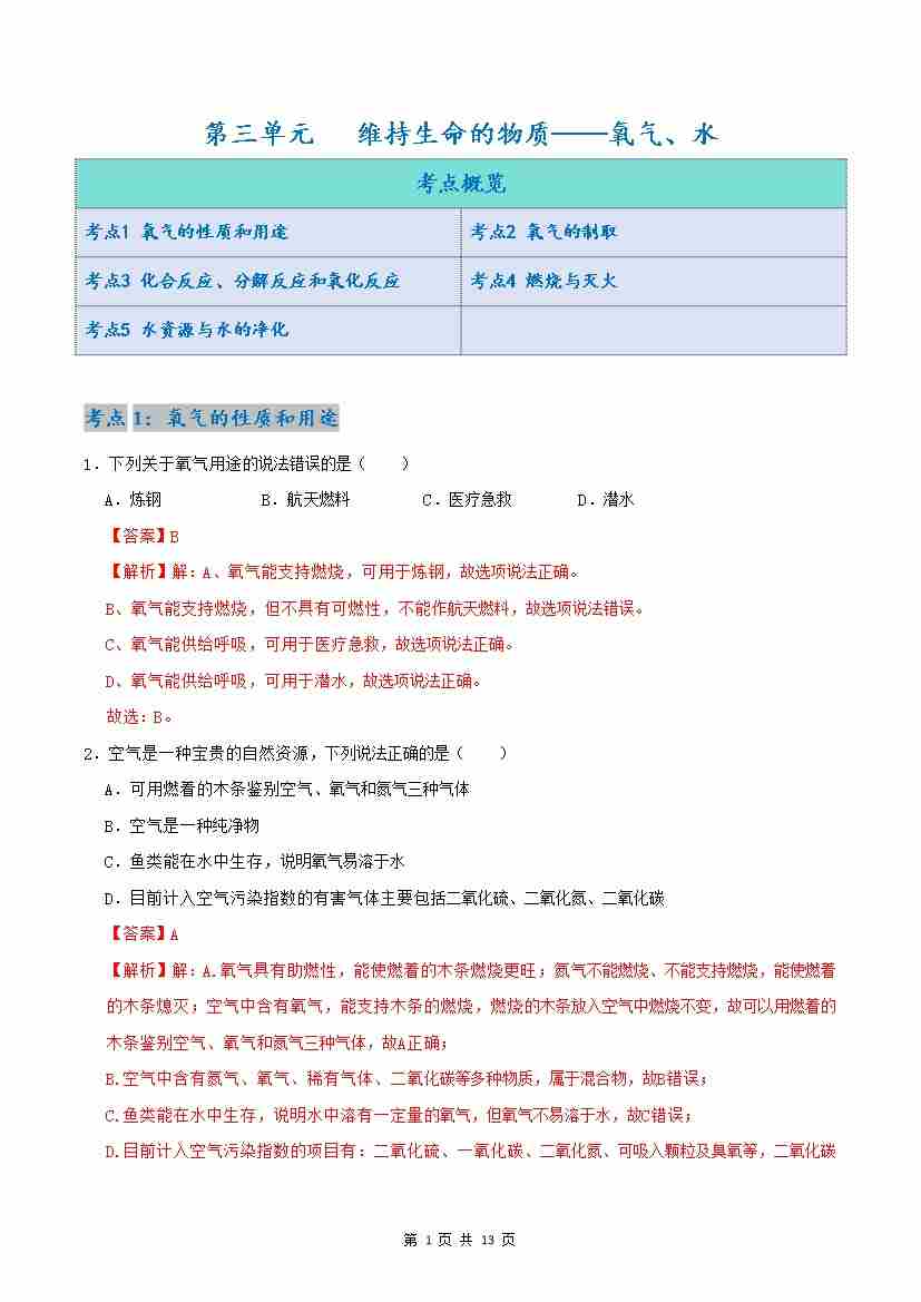 首页 > 全部 > 单元测试 > 第3单元 维持生命的物质——氧气、水 【单元卷·考点卷】(解析版)