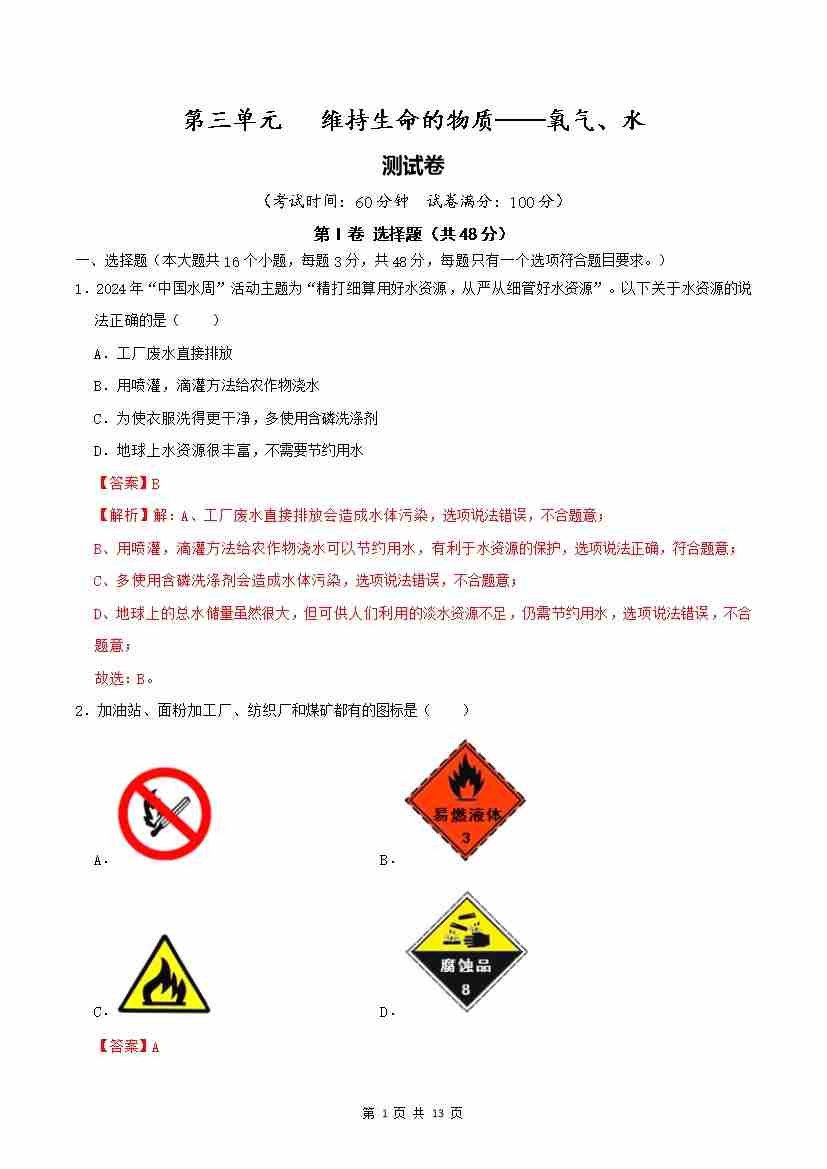 首页 > 全部 > 单元测试 > 第3单元 维持生命的物质——氧气、水 【单元卷·测试卷】(解析版)