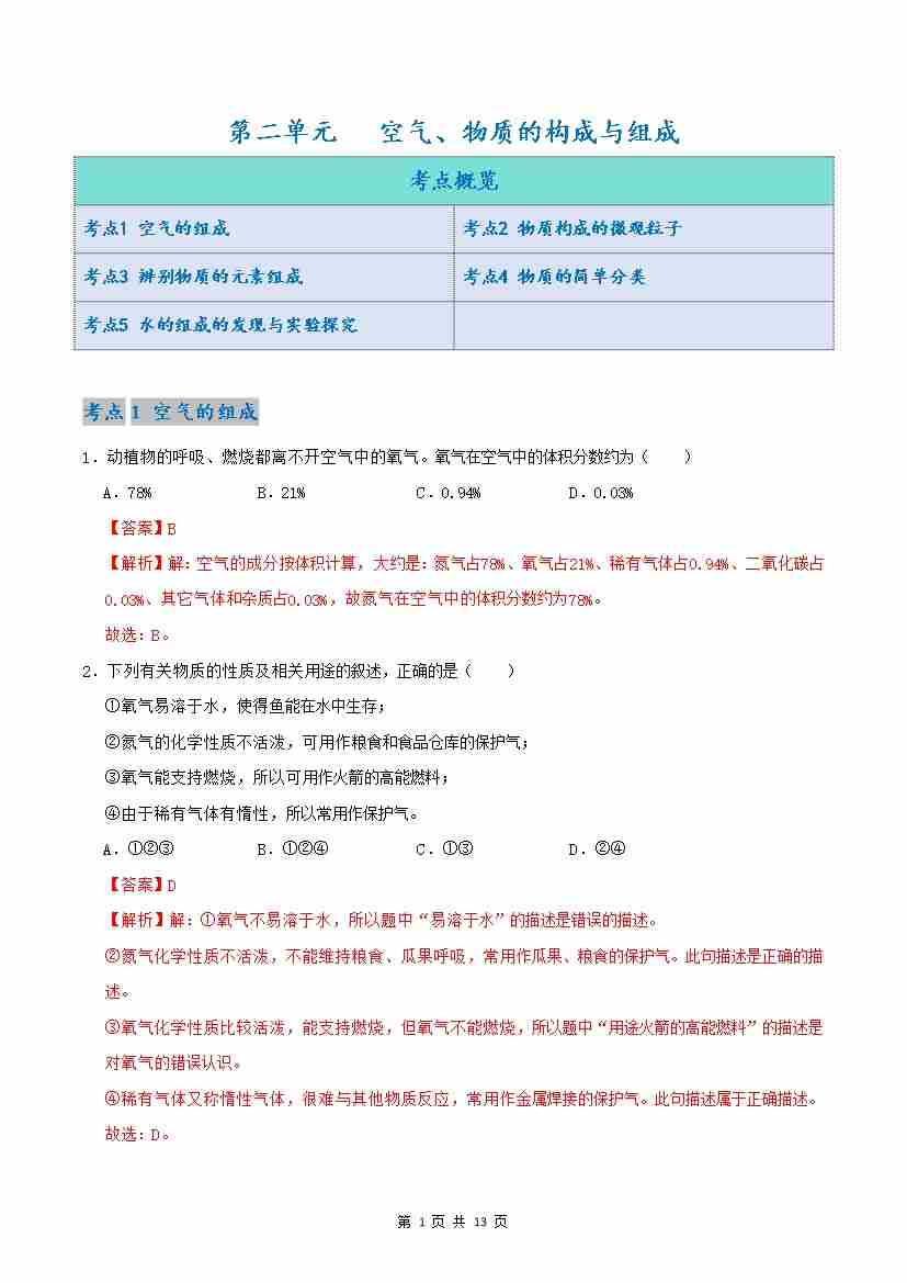 第2单元 空气、物质的构成与组成 【单元卷·考点卷】(解析版)