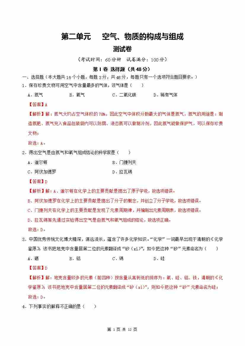 首页 > 全部 > 单元测试 > 第2单元 空气、物质的构成与组成 【单元卷·测试卷】(解析版)