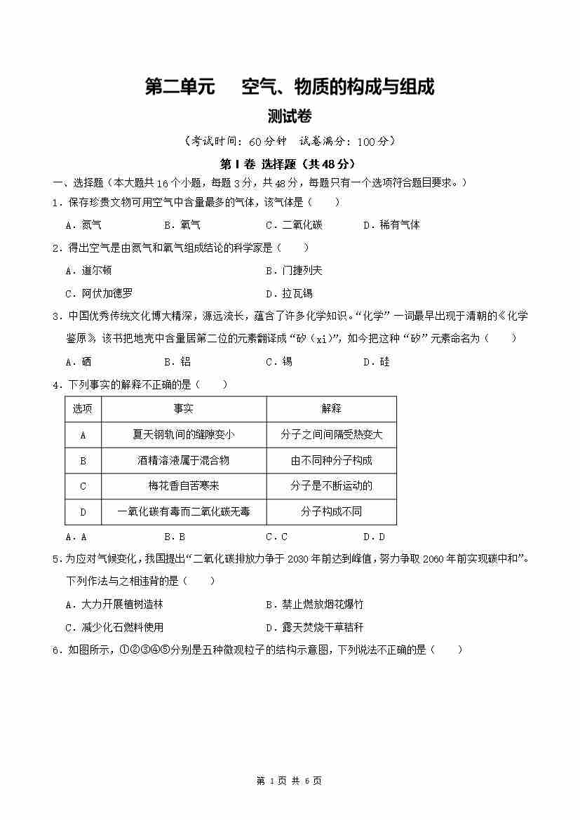 首页 > 全部 > 单元测试 > 第2单元 空气、物质的构成与组成 【单元卷·测试卷】(原卷版)