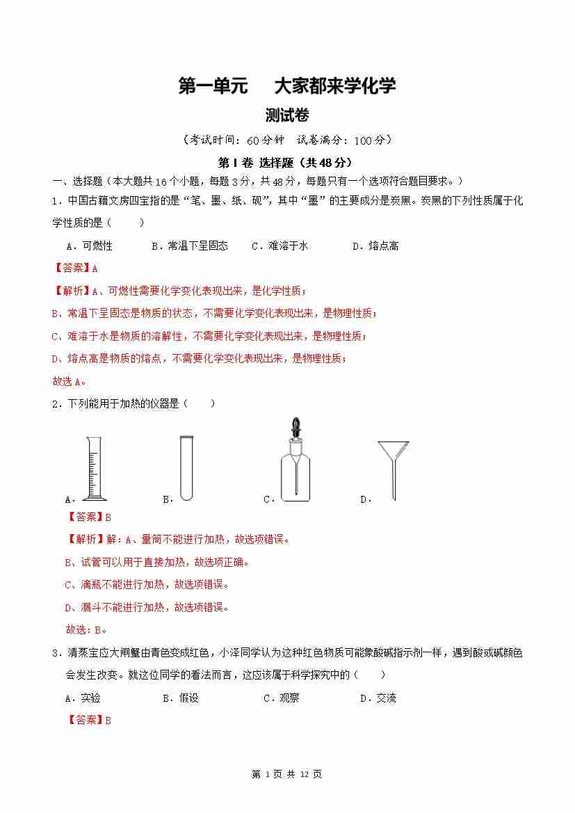 第一单元 大家都来学化学【单元卷·测试卷】(解析版)
