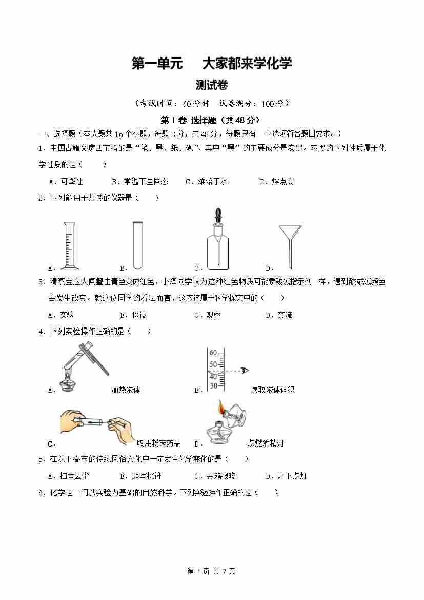 第一单元 大家都来学化学【单元卷·测试卷】(原卷版)