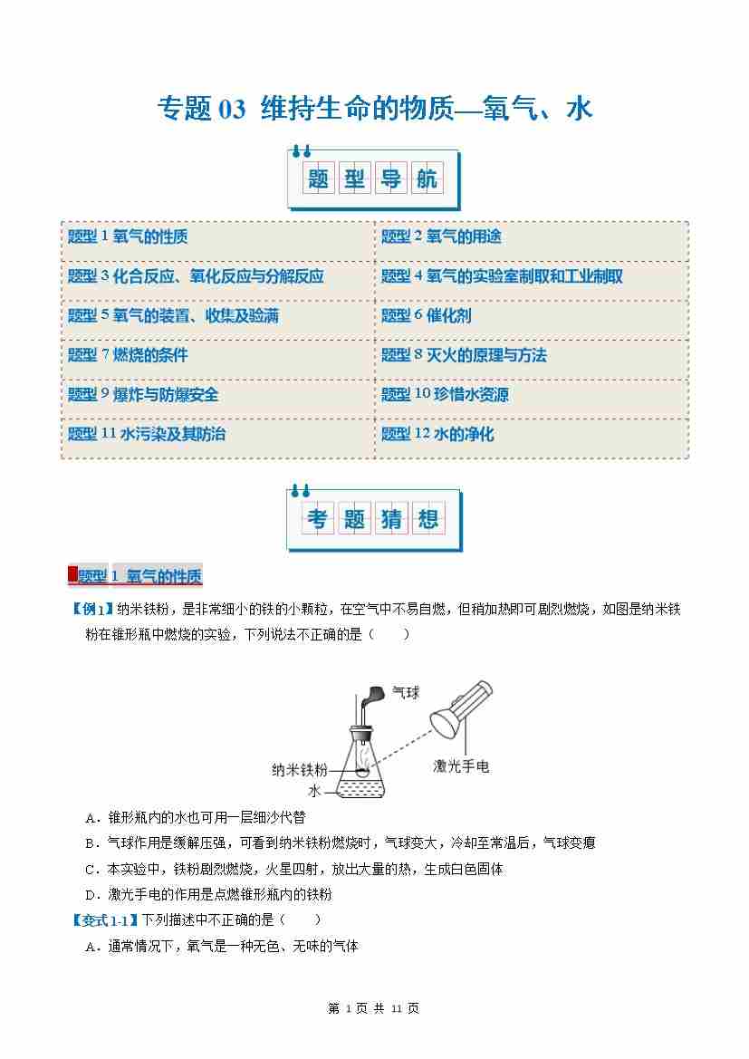 专题03 维持生命的物质—氧气、水(考题猜想)(12大题型)(原卷版)