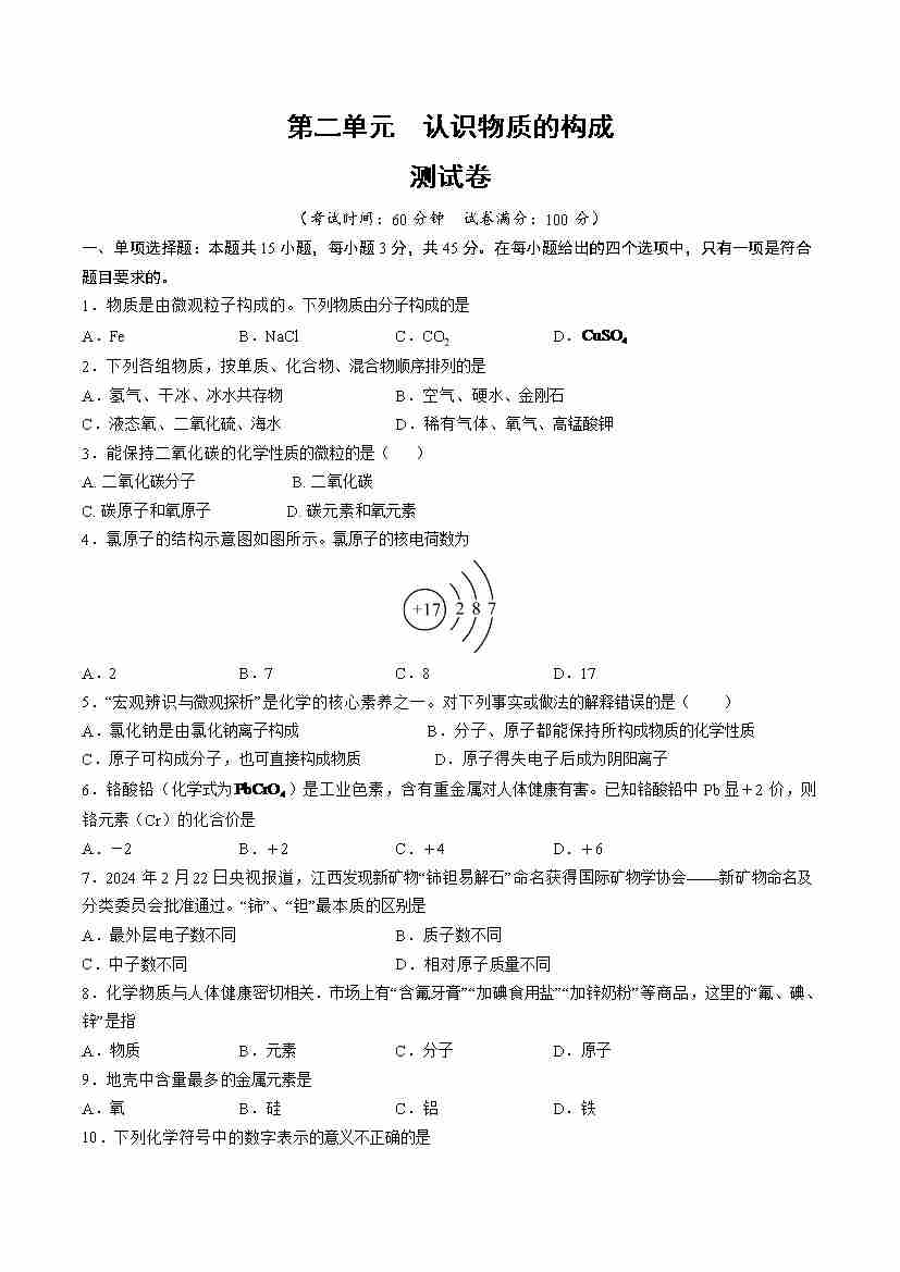 第二单元 认识物质的构成【单元卷·测试卷】(原卷版)