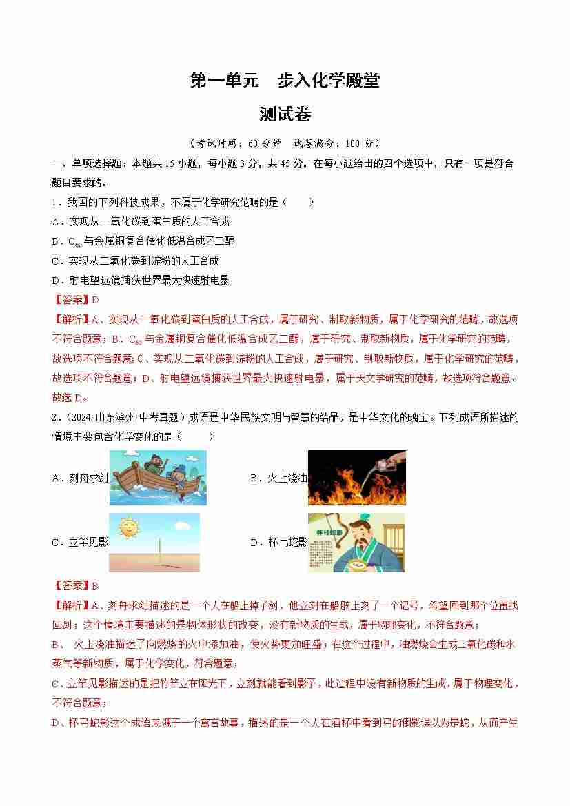 第一单元 步入化学殿堂【单元卷·测试卷】(解析版)