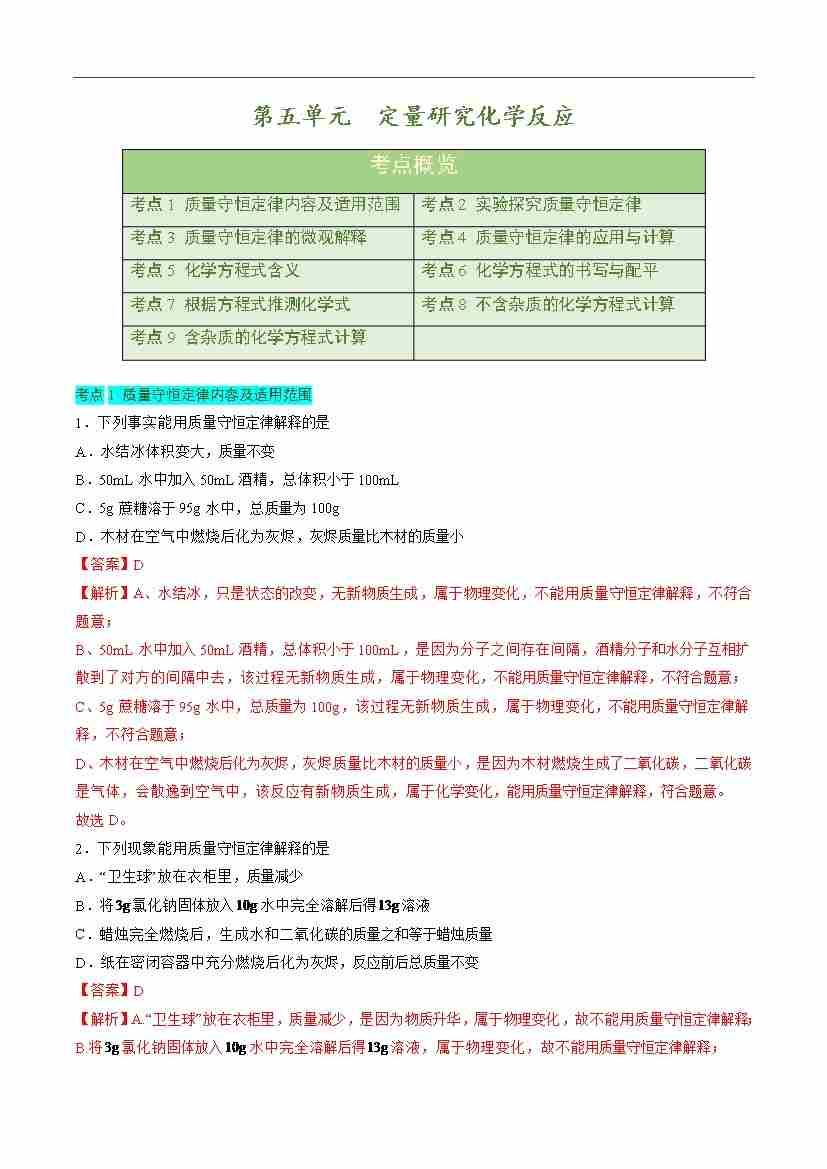 首页 > 全部 > 单元考点卷 > 第五单元 定量研究化学反应【单元卷·考点卷】(解析版)
