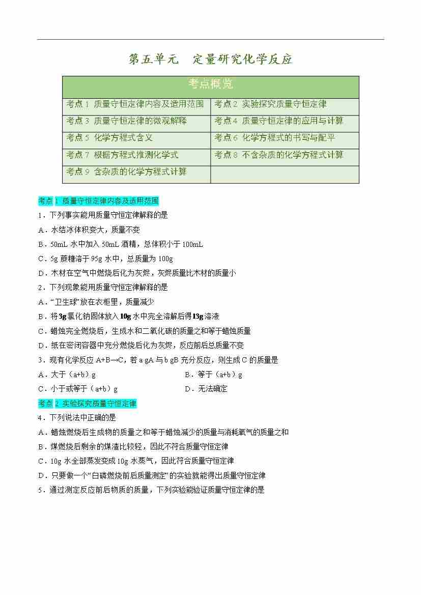 第五单元 定量研究化学反应【单元卷·考点卷】(原卷版)