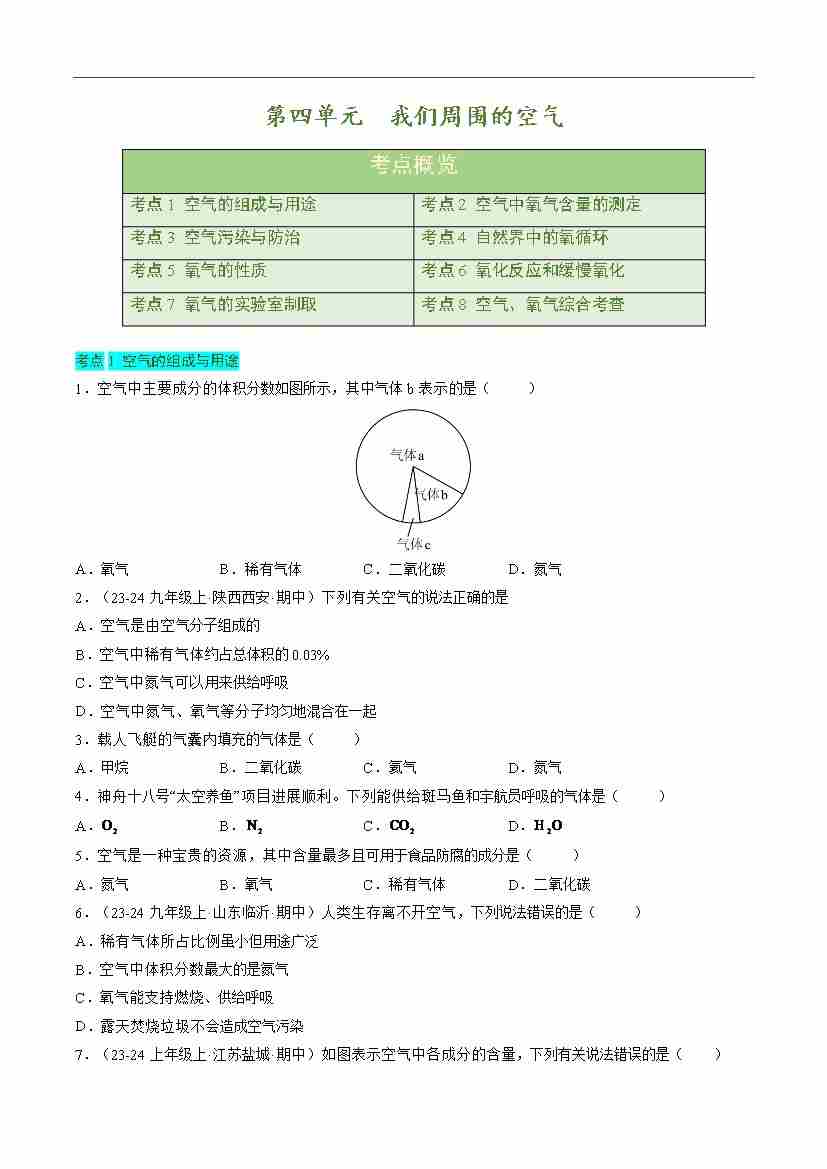 首页 > 全部 > 单元考点卷 > 第四单元 我们周围的空气【单元卷·考点卷】(原卷版)