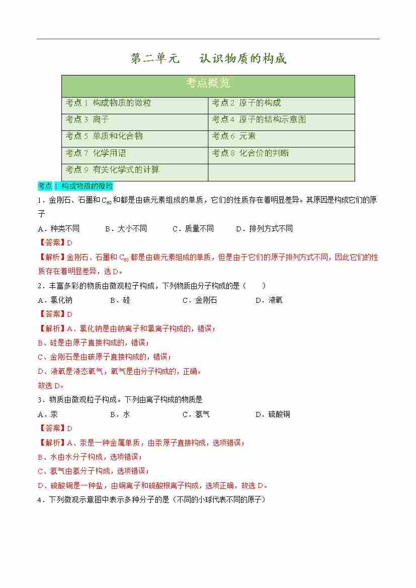第二单元 认识物质的构成【单元卷·考点卷】(解析版)