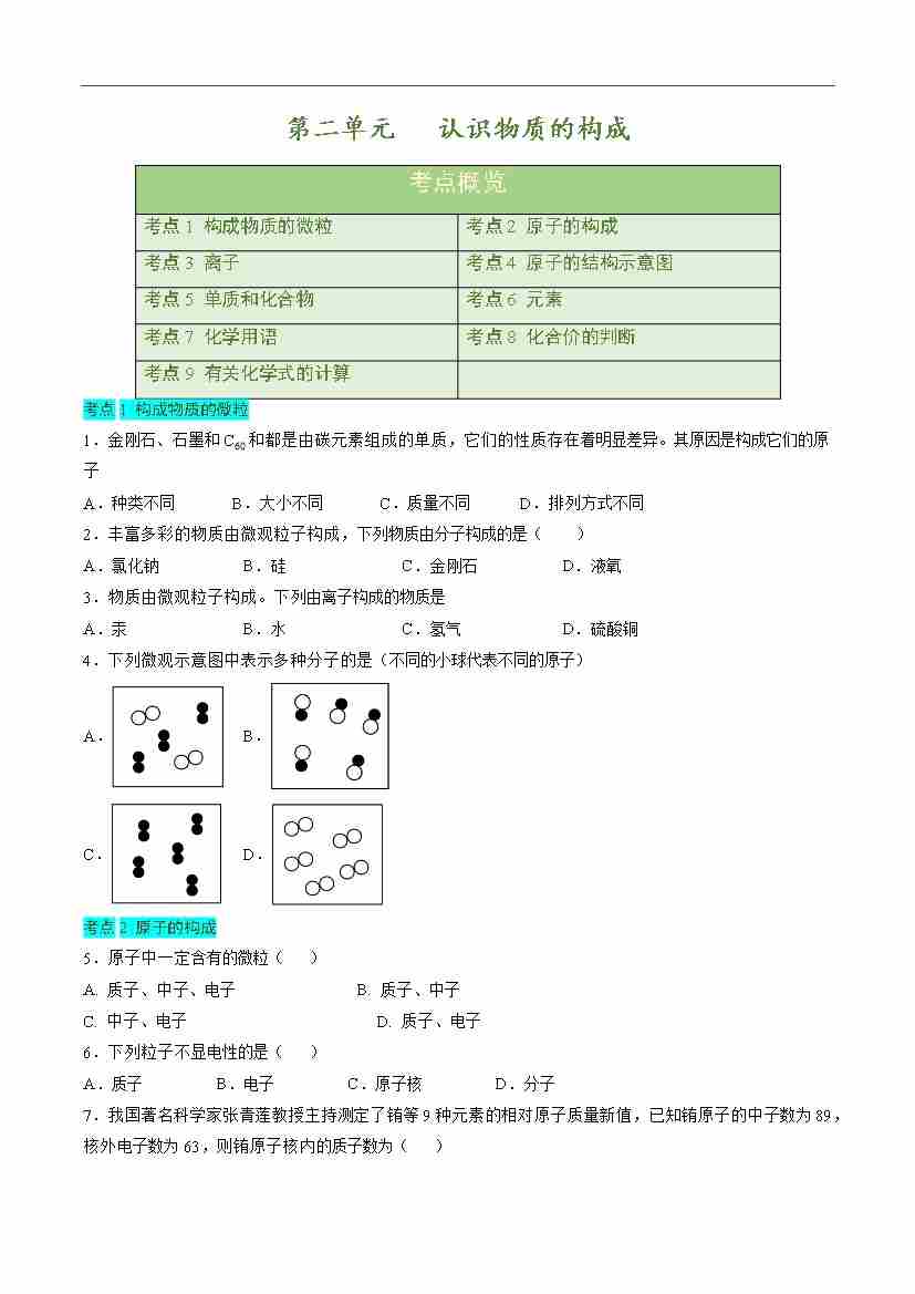 首页 > 全部 > 单元考点卷 > 第二单元 认识物质的构成【单元卷·考点卷】(原卷版)