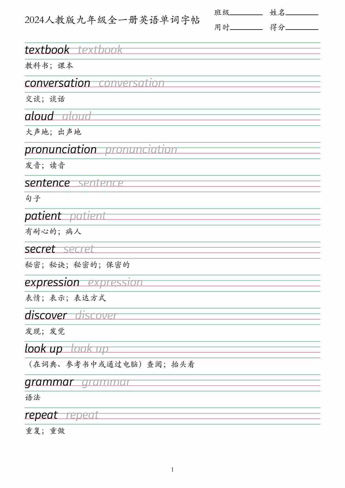 首页 > 全部 > 单词默背表 > 2024人教版九年级全一册英语单词字帖—衡水体