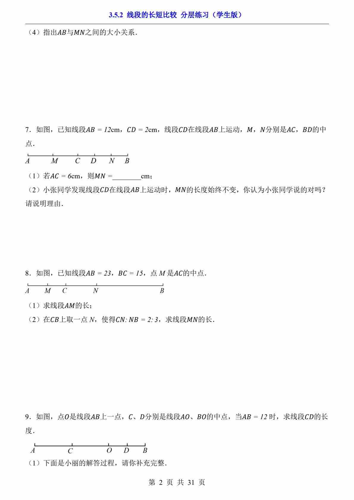 3.5.2 线段的长短比较(分层练习)