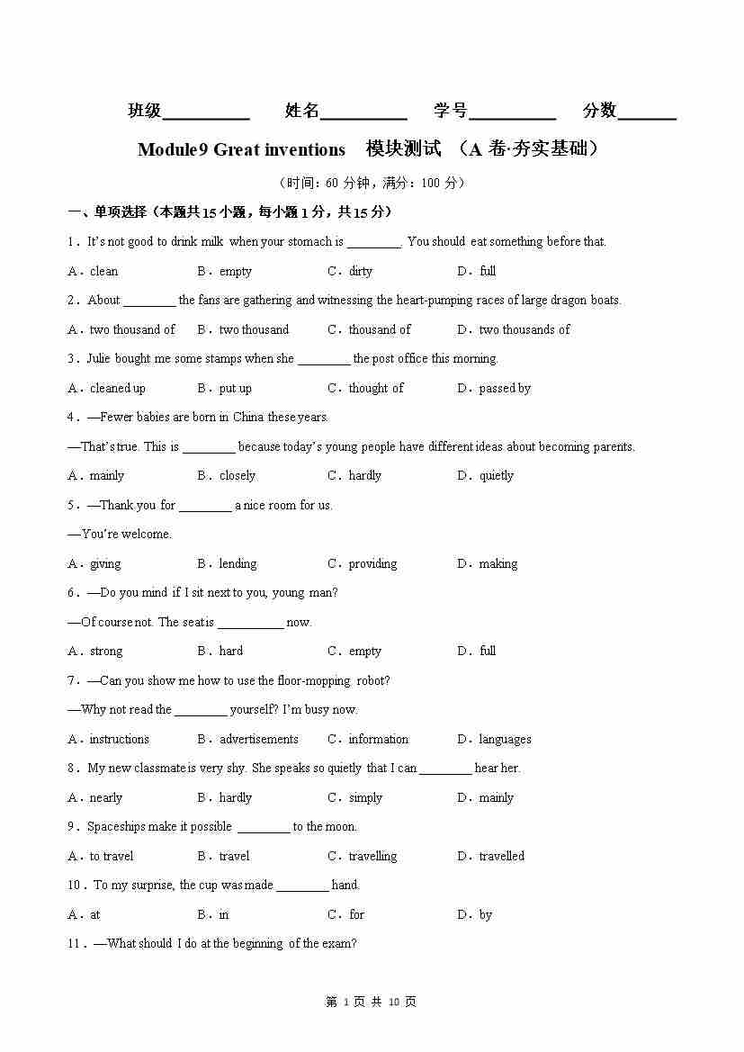 首页 > 全部 > 同步AB卷 > Module09(A卷·夯实基础)-(原卷版)