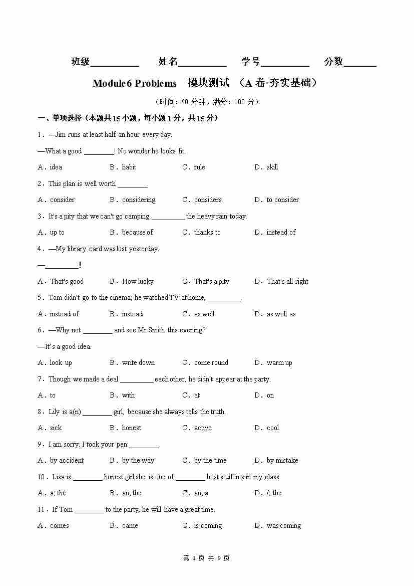 Module06(A卷·夯实基础)-(原卷版)