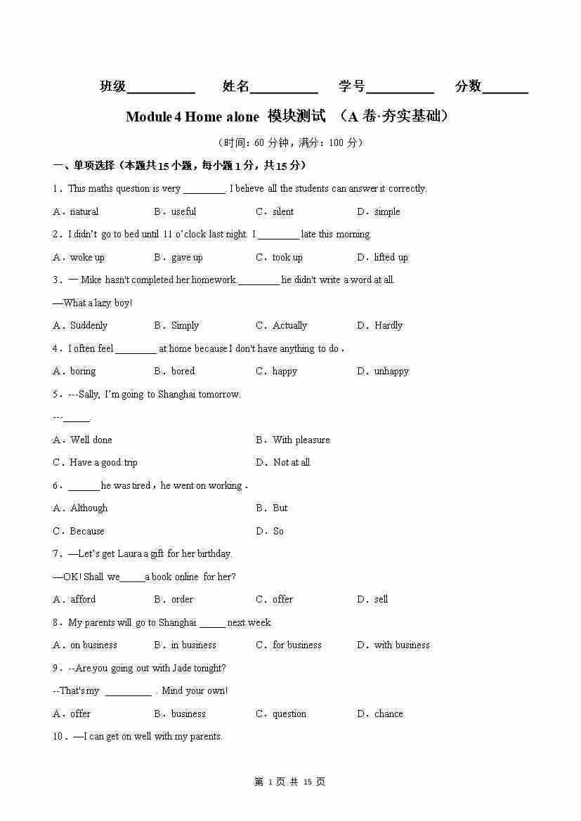 首页 > 全部 > 同步AB卷 > Module04(A卷·夯实基础)-(解析版)