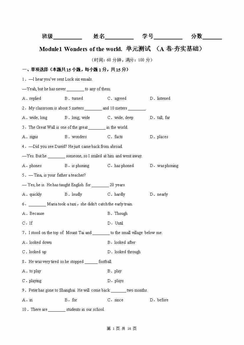 首页 > 全部 > 同步AB卷 > Module01(A卷·夯实基础)-(解析版)