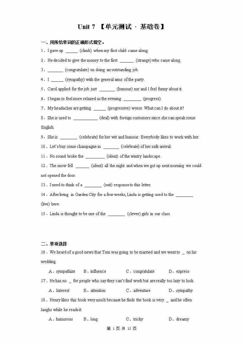 Unit 7 【单元测试 · 基础卷】