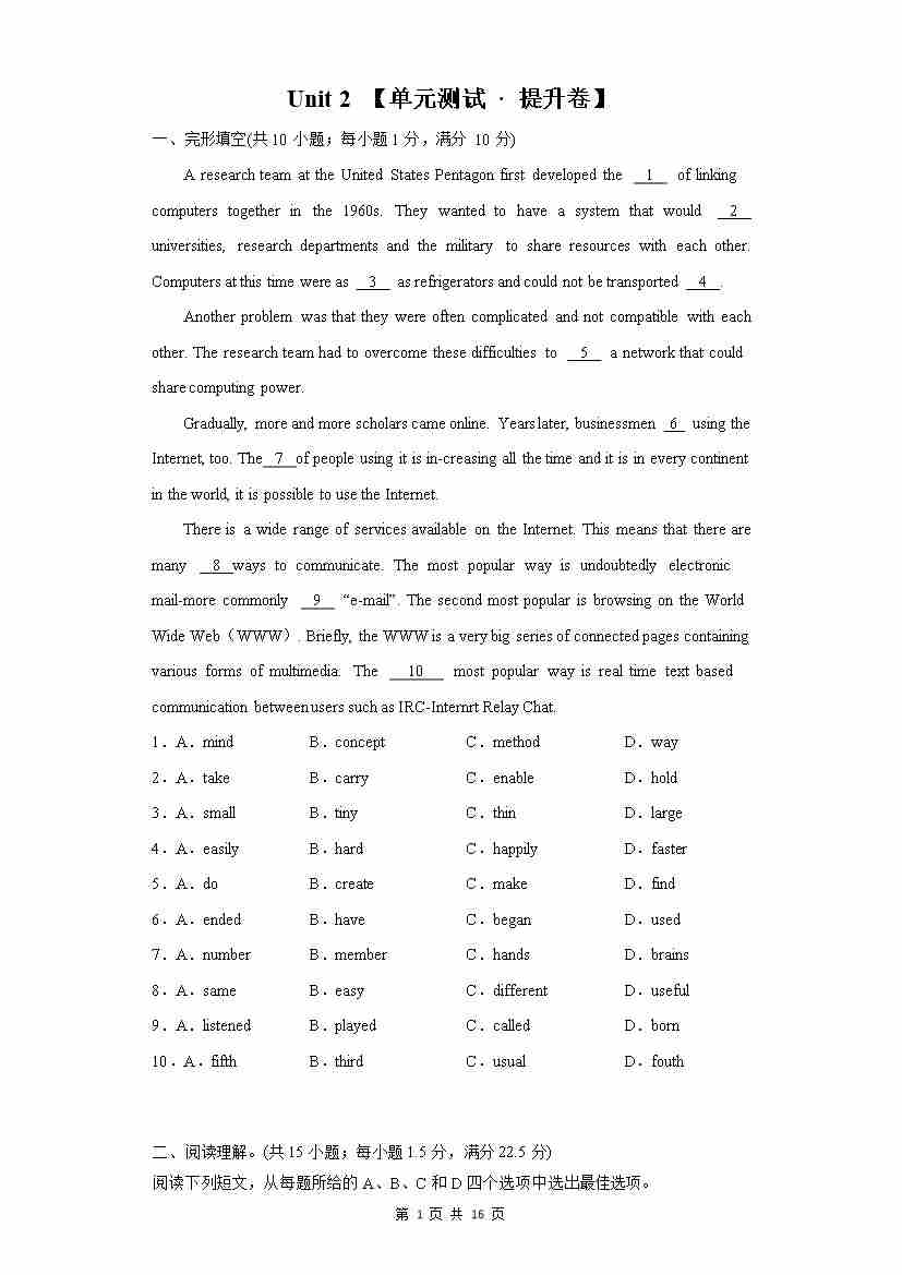 Unit 2【单元测试 · 提高卷】