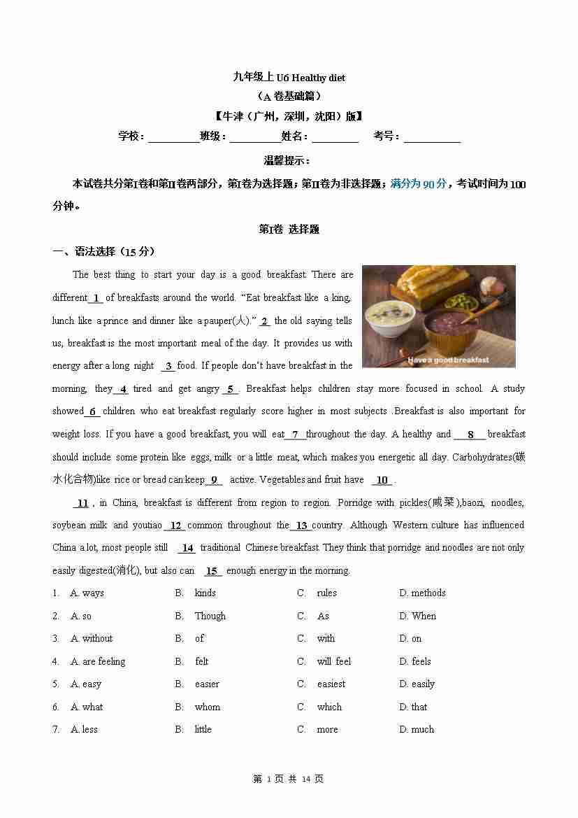 首页 > 全部 > 单元AB卷 > 7.1 U6 Healthy diet (A卷·夯实基础) 解析版