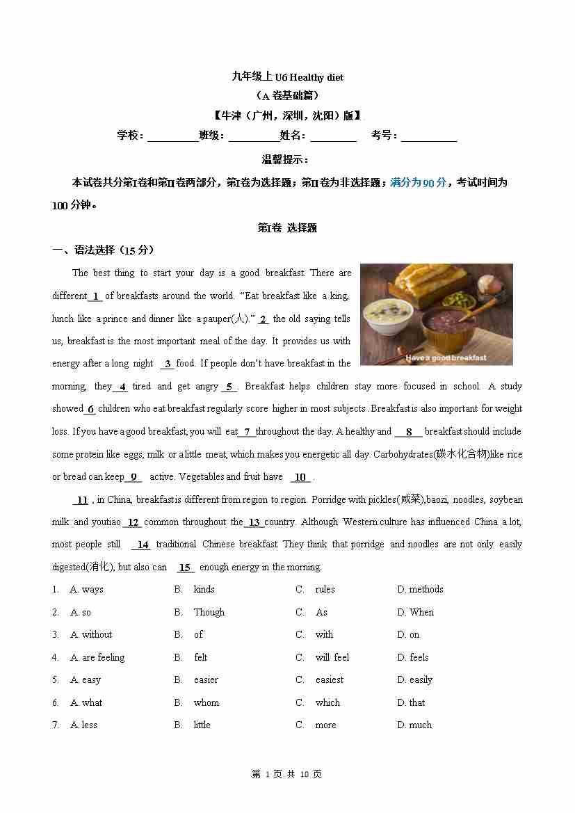 首页 > 全部 > 单元AB卷 > 7.1 U6 Healthy diet (A卷·夯实基础) 原卷版