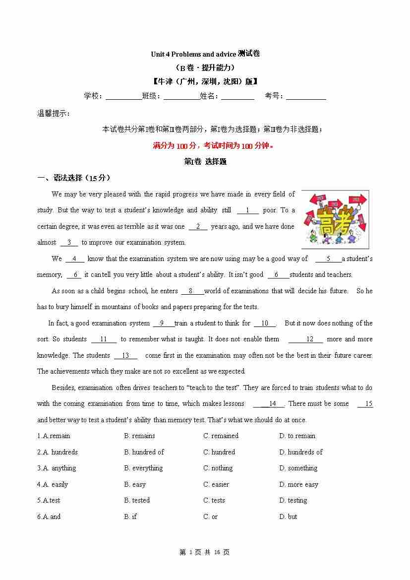 4.2 Unit 4 Problems and advice 测试卷 (B卷·提升能力) 解析版