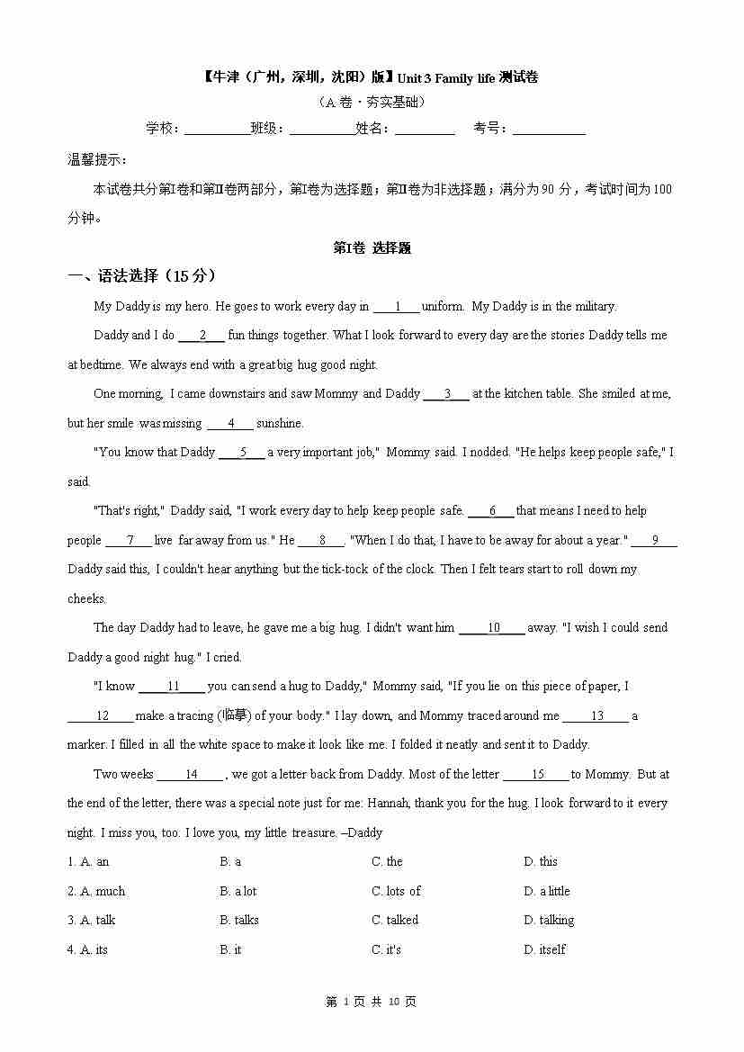 首页 > 全部 > 单元AB卷 > 3.1 Unit 3 Family life 测试卷 (A卷·夯实基础)原卷版