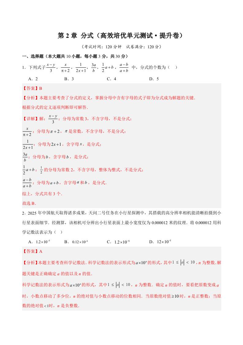 首页 > 全部 > 预习讲义 > 第2章 分式(高效培优单元测试·提升卷)(教师版)