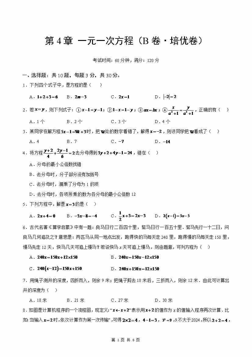 首页 > 全部 > 单元测试 > 第4章 一元一次方程(B卷·提升卷 单元重点综合测试)(原卷版)
