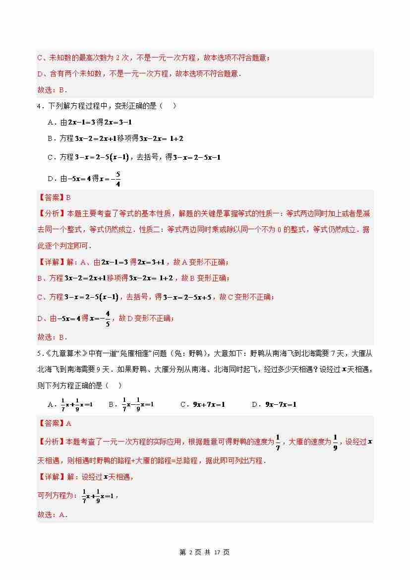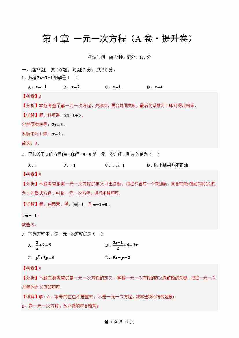 首页 > 全部 > 单元测试 > 第4章 一元一次方程(A卷·提升卷 单元重点综合测试)(解析版)