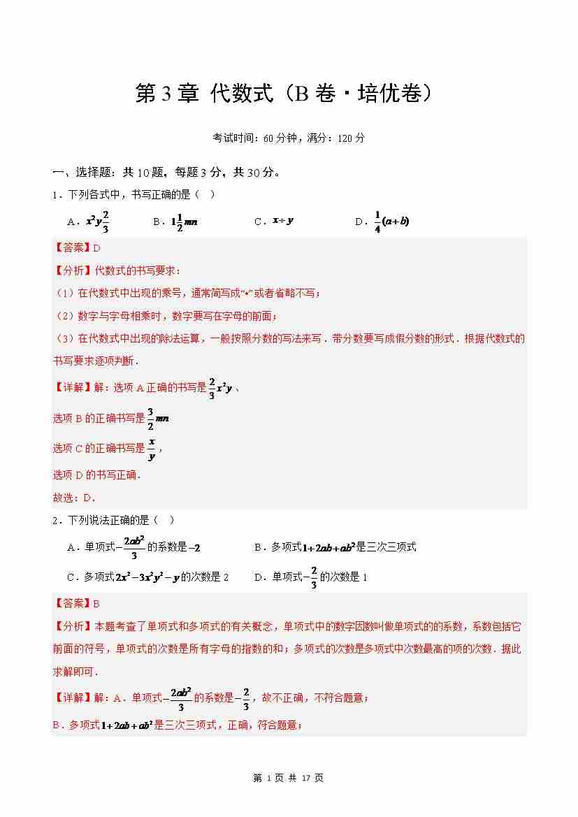首页 > 全部 > 单元测试 > 第3章 代数式(B卷·培优卷 单元重点综合测试)(解析版)