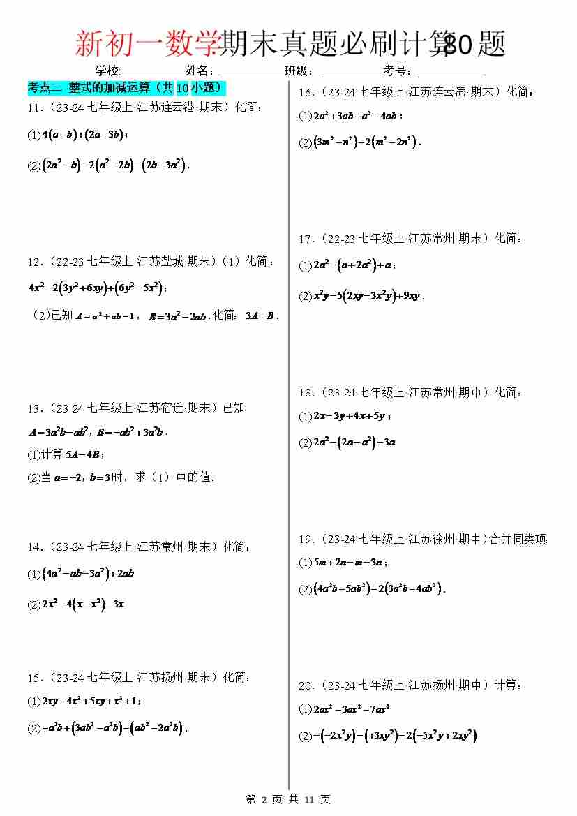 首页 > 全部 > 期末专项 > 期末真题必刷计算80题(8个考点专练)(原卷版)