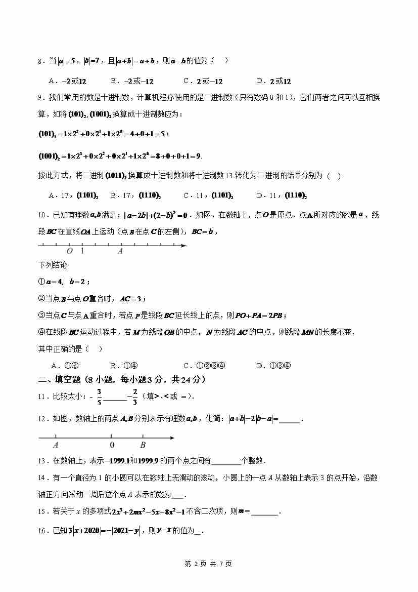 首页 > 全部 > 期中试卷 > 七年级上学期期中模拟卷02(考试范围:数学与我们同行、有理数、代数式)(原卷版)