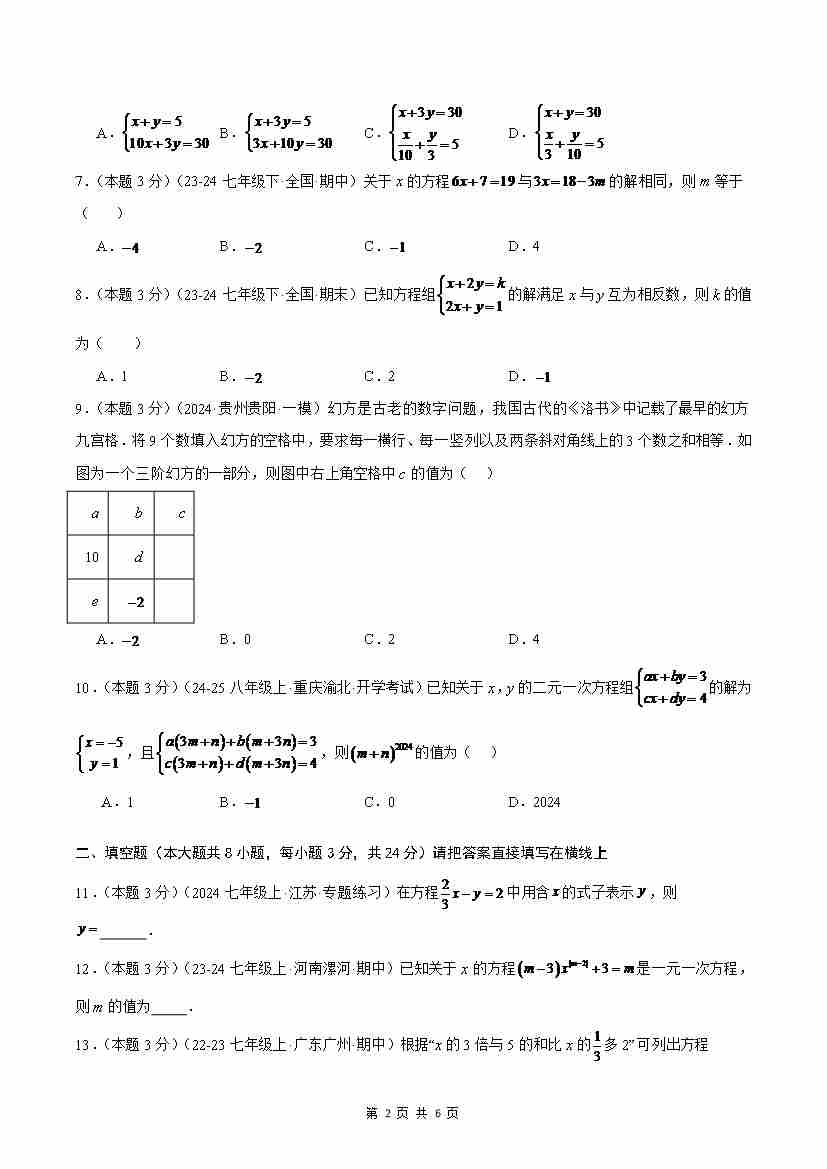 首页 > 全部 > 单元测试 > 第3章 一次方程(组)(单元重点综合测试)(原卷版)