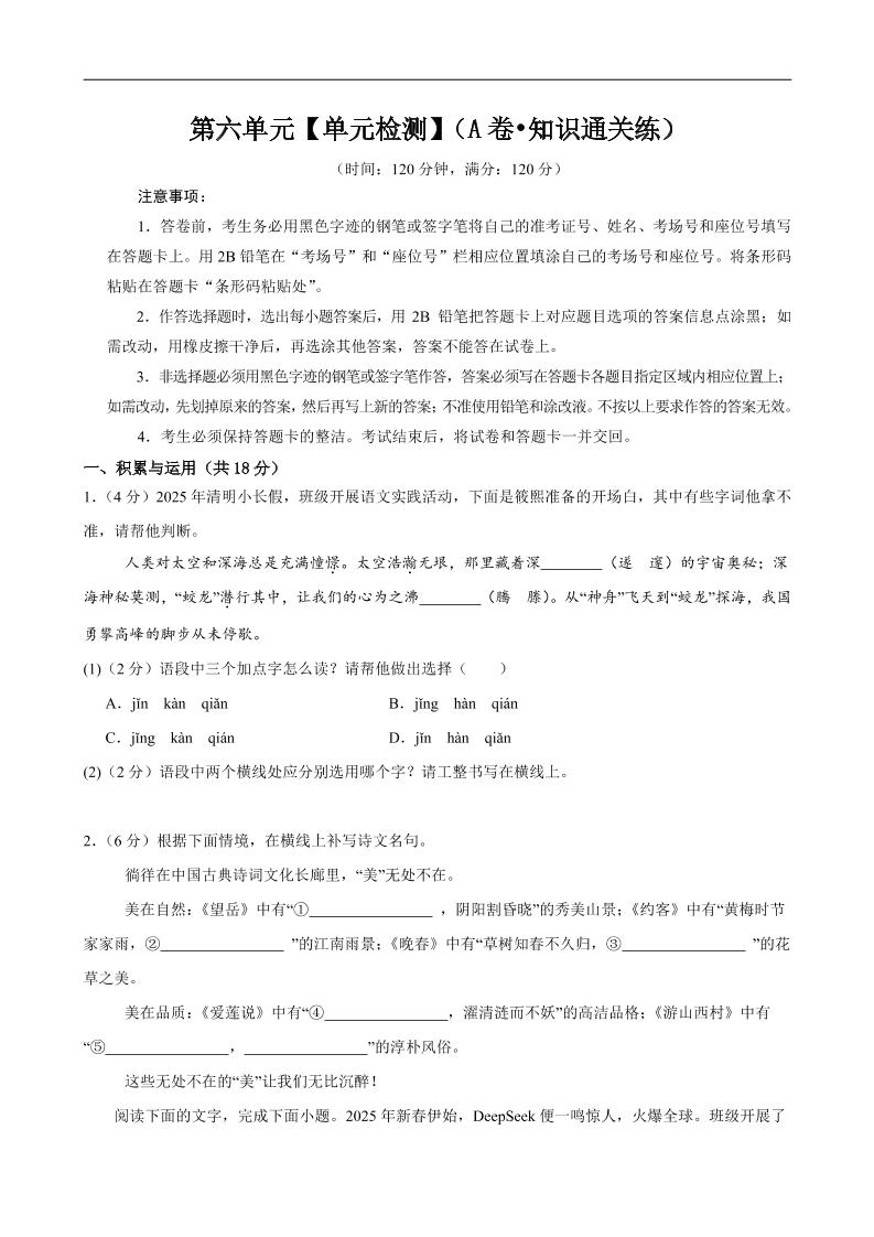 12.第六单元【单元检测】(A卷•知识通关练)(原卷版)