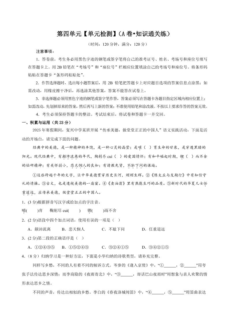 首页 > 全部 > 单元通关卷 > 8.第四单元【单元检测】(A卷•知识通关练)(原卷版)