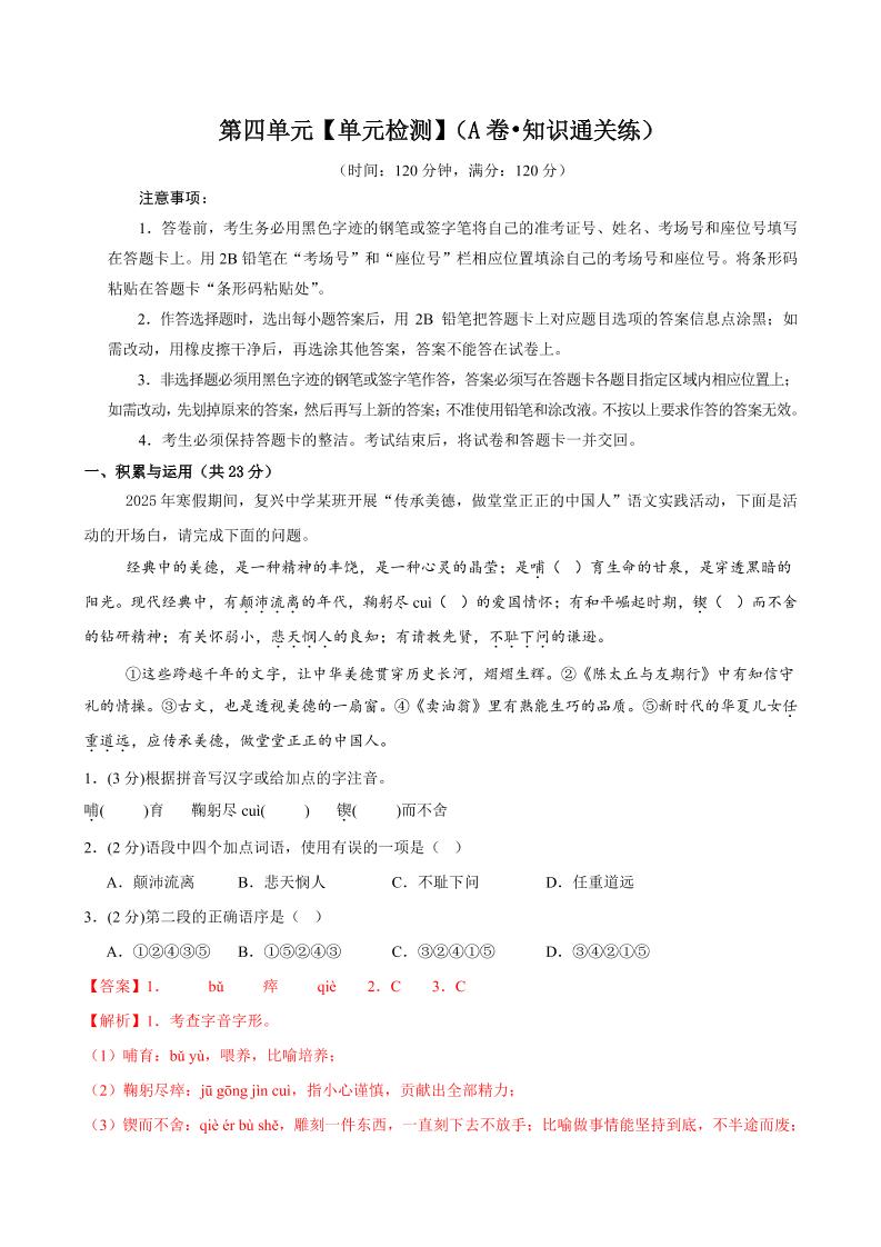 首页 > 全部 > 单元通关卷 > 7.第四单元【单元检测】(A卷•知识通关练)(解析版)