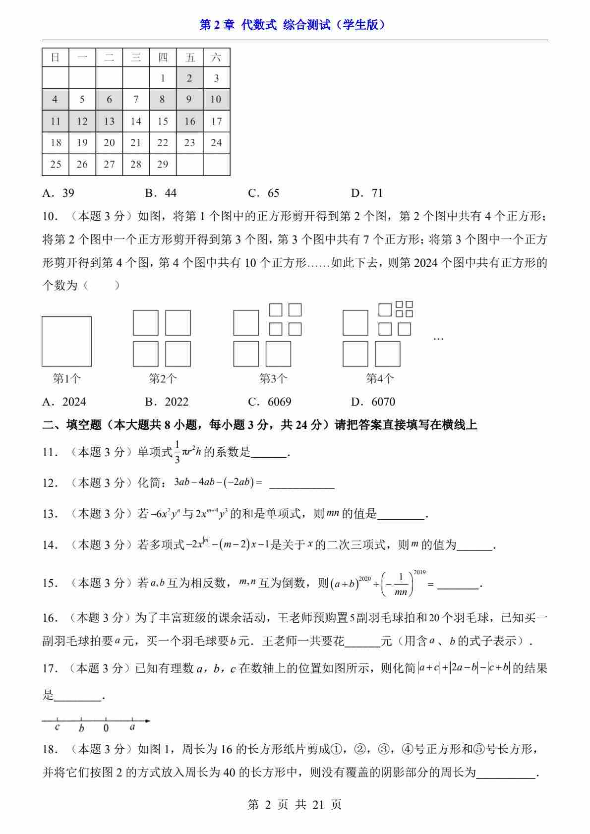 首页 > 全部 > 单元测试 > 第2章 代数式(综合测试)