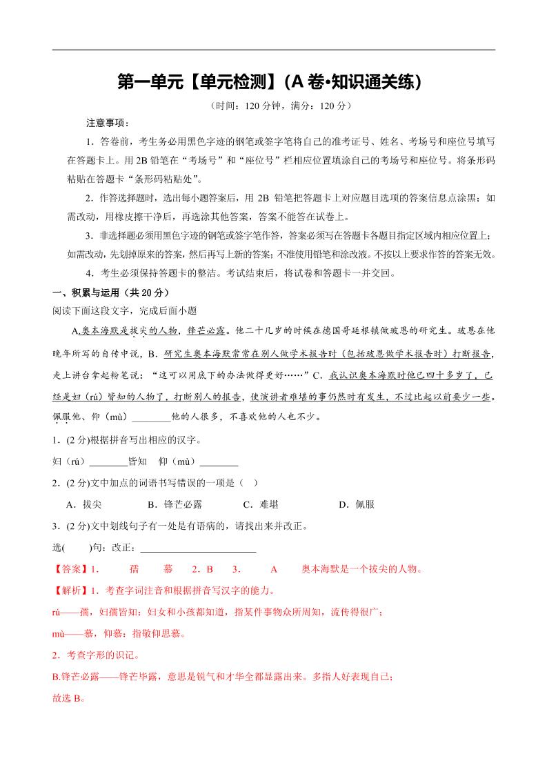 1.第一单元【单元检测】(A卷•知识通关练)(解析版)