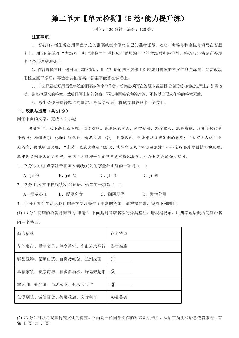 首页 > 全部 > 单元提升卷 > 4.第二单元【单元检测】(B卷•能力提升练)(原卷版)