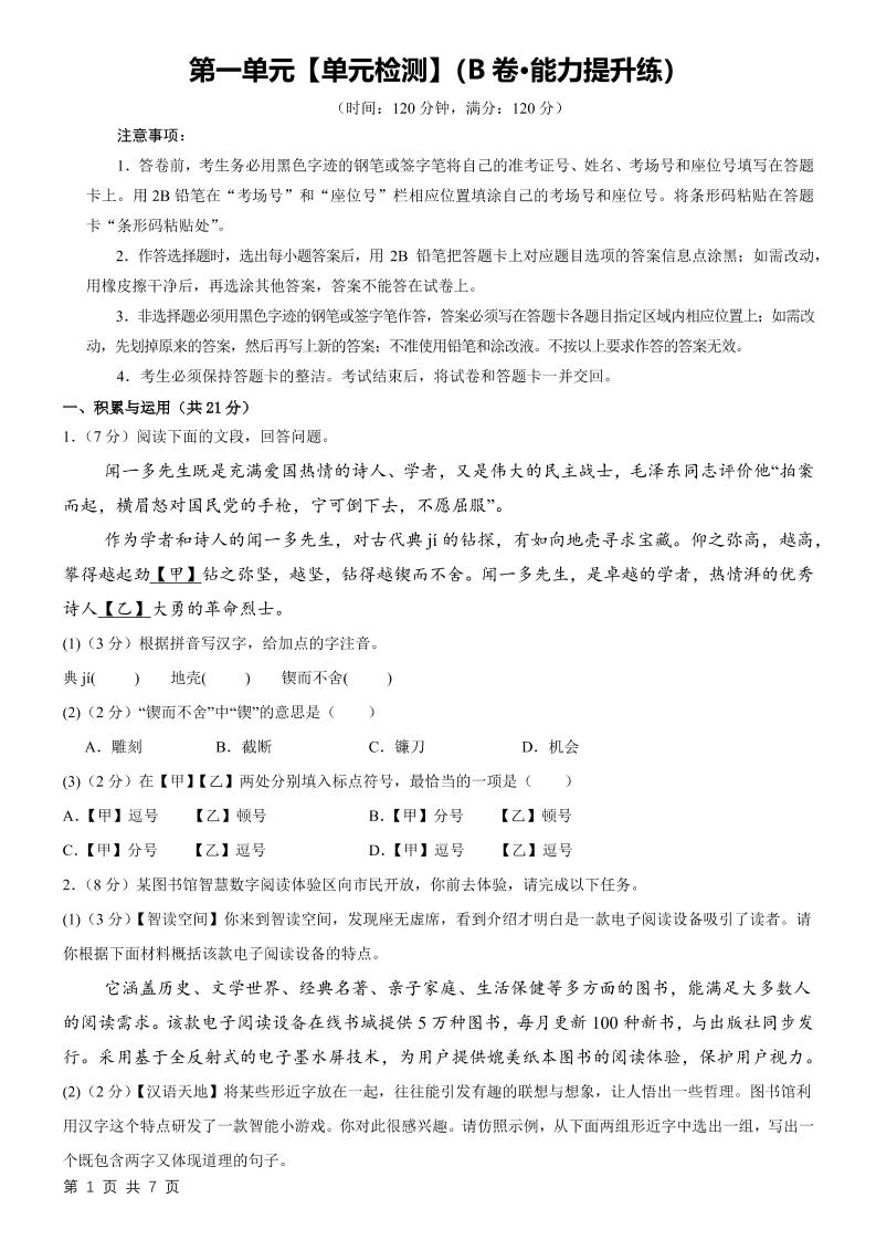 首页 > 全部 > 单元提升卷 > 2.第一单元【单元检测】(B卷•能力提升练)(原卷版)